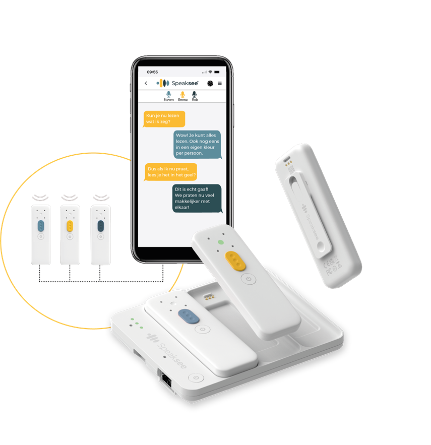 Voor gesprekken met meerdere deelnemers biedt Speaksee Microfoonkits. Elke spreker draagt een persoonlijke microfoon die automatisch wordt herkend door de app. De gesproken tekst verschijnt in de app in een overzichtelijke weergave, bijvoorbeeld met kleurcodering per spreker, zodat iedereen duidelijk kan volgen wie wat zegt.